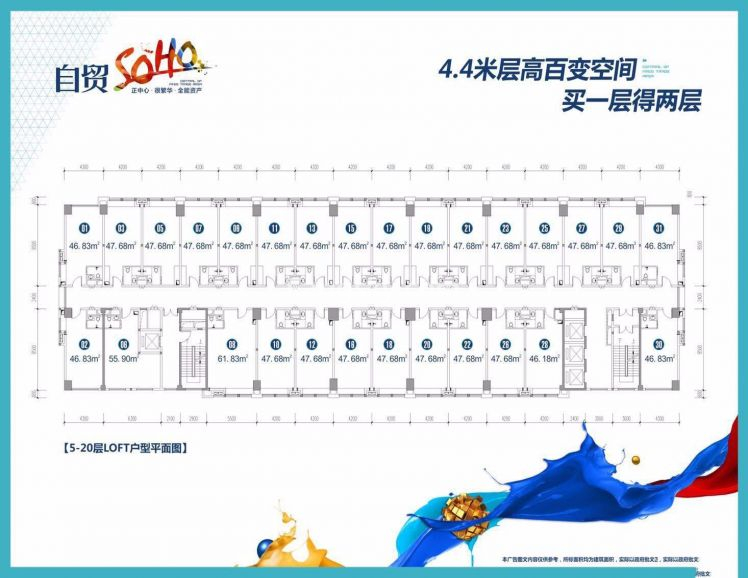 自贸SOHO 商住两用综合体,在售47㎡公寓,挑高4.4米,可做两层,买一层送一层!